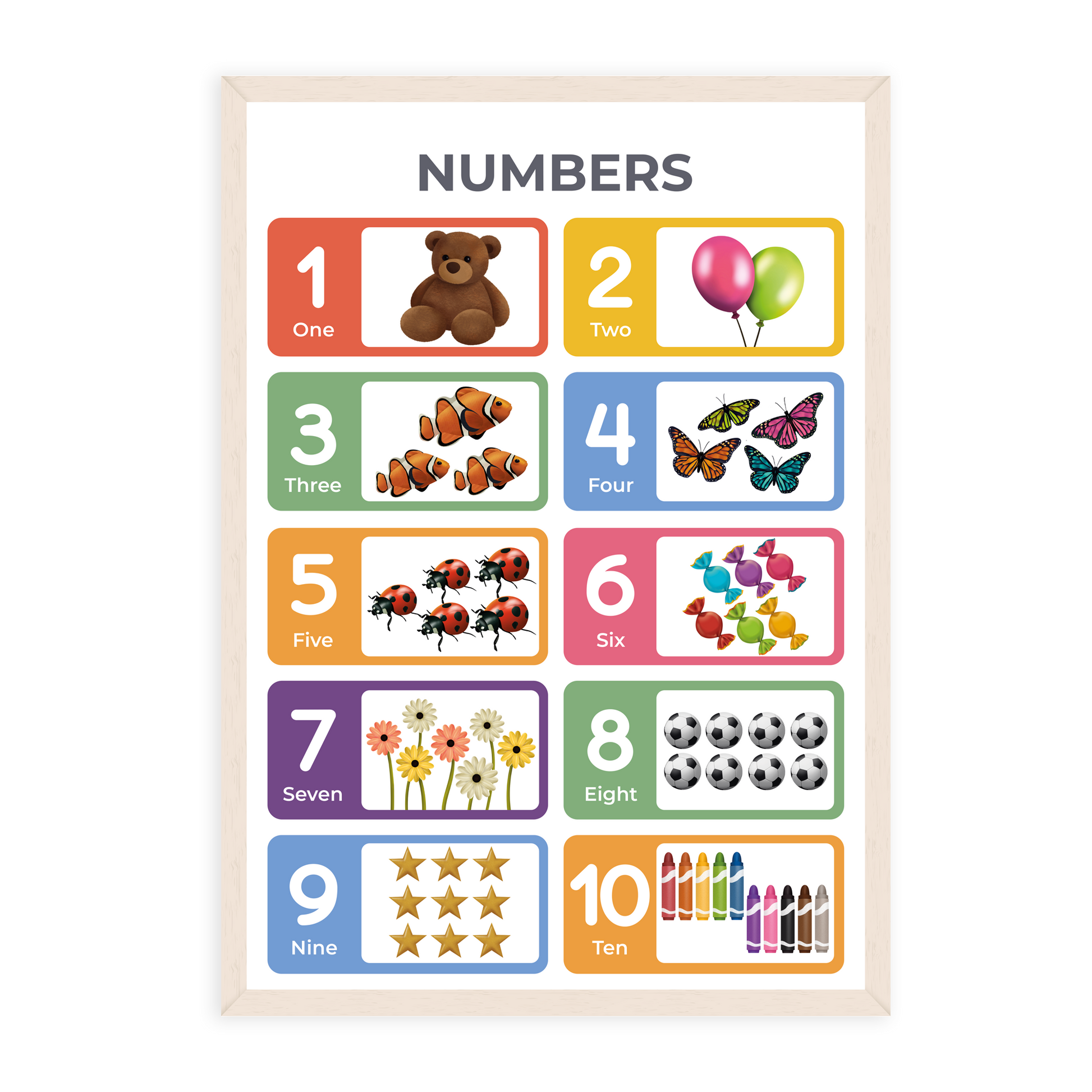 Teach your toddler to count from 1 to 10 with this beautifully designed poster. Printed on durable 350gsm silk A3 card with double-sided gloss lamination for added protection against tears and water.