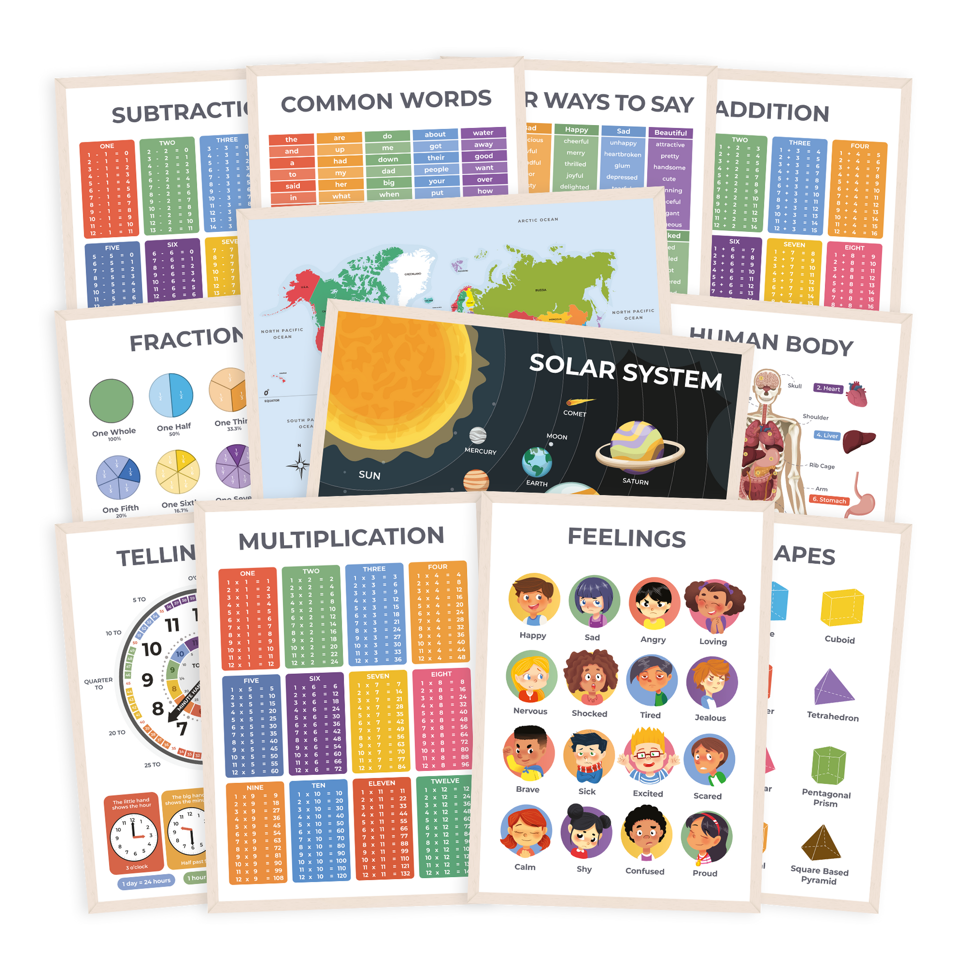 Introduce your children to the wonderful world of learning with our exquisite collection of educational posters. This 12 pack includes a variety of topics such as Times Tables, Addition, Subtraction, Fractions, Common Words, Telling Time, World Map, Human Body, Other Ways to Say, Solar System, 3D Shapes & Feelings.