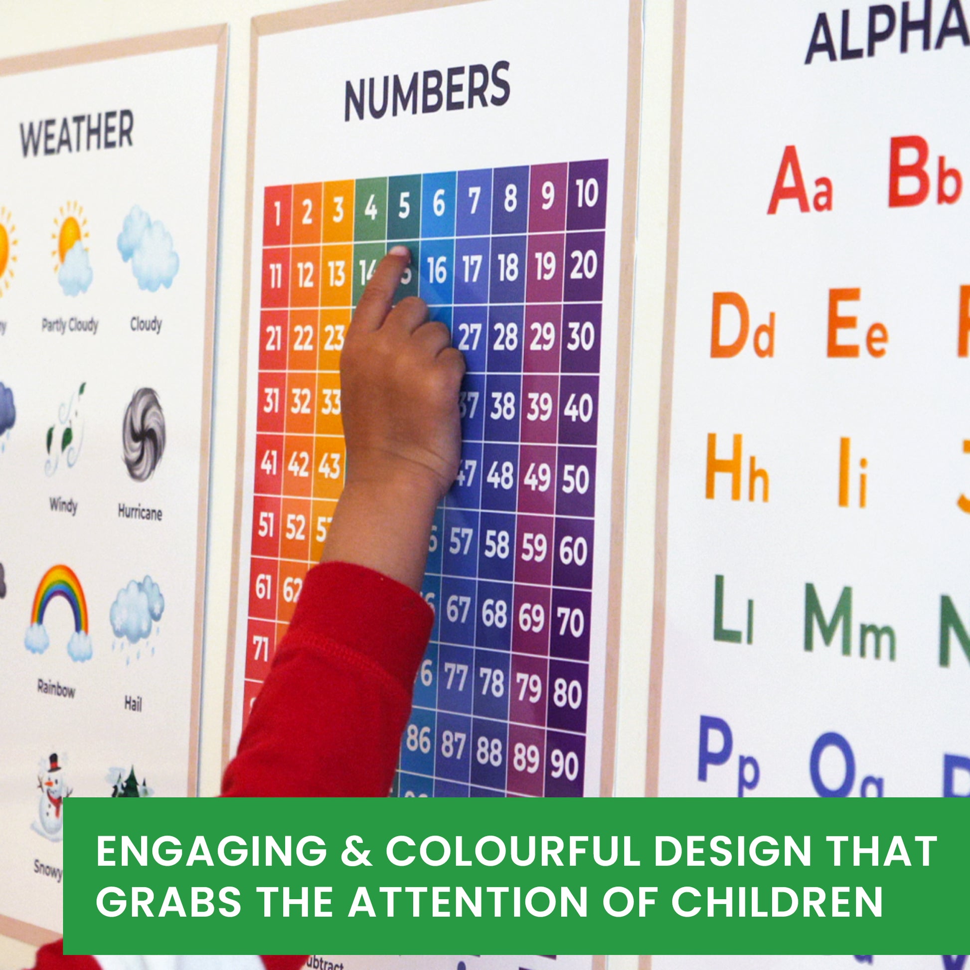 Enhance your child's learning journey with our best-selling educational posters collection. This 12 pack includes Alphabet, Numbers 1-100, Days of the Week, Months of the Year, Weather, Colours, Shapes, Farm Animals, Zoo Animals, Fruits, Vegetables & Transport.