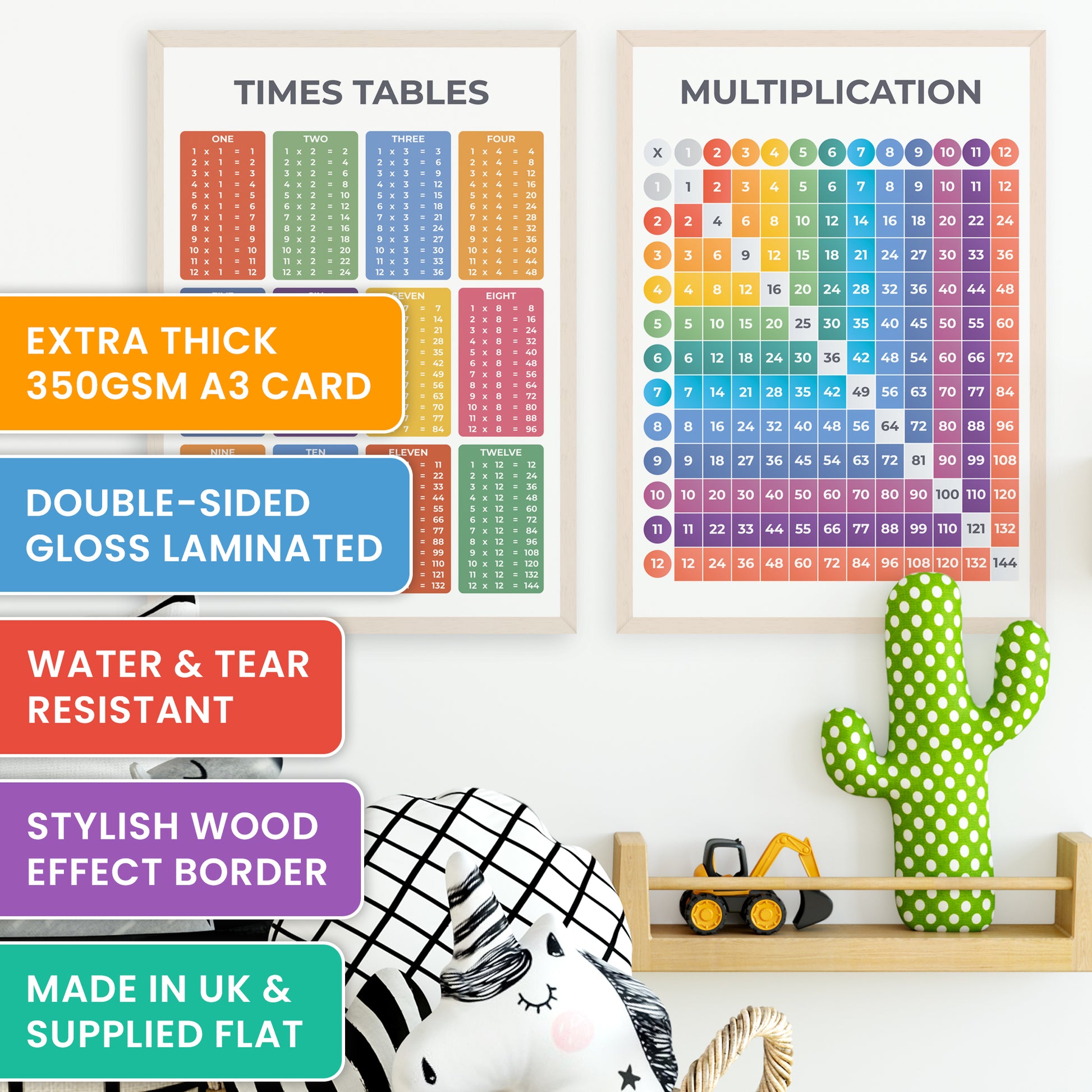 Master multiplication with our Times Tables poster and Multiplication Square poster. Printed on 350gsm silk A3 card with double-sided gloss lamination, our posters are tear & water resistant.